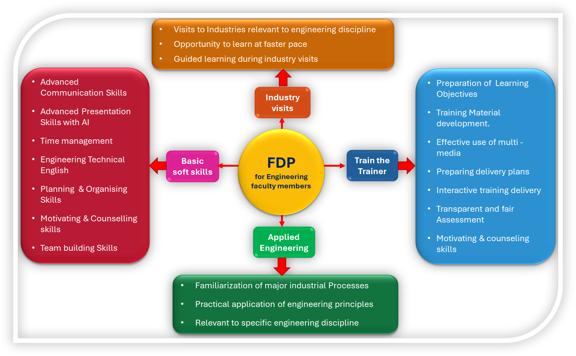 This Faculty Development Program (FDP) is designed to build the capabilities of engineering college faculty members who are new to the teaching profession, enabling them to plan, design, and deliver teaching sessions more effectively and confidently. A strong foundation in the industrial applications of engineering principles, combined with excellent pedagogical skills, will significantly enhance a lecturer’s effectiveness in the classroom.his Faculty Development Program (FDP) is designed to build the capabilities of engineering college faculty members who are new to the teaching profession, enabling them to plan, design, and deliver teaching sessions more effectively and confidently. A strong foundation in the industrial applications of engineering principles, combined with excellent pedagogical skills, will significantly enhance a lecturer’s effectiveness in the classroom.sed
